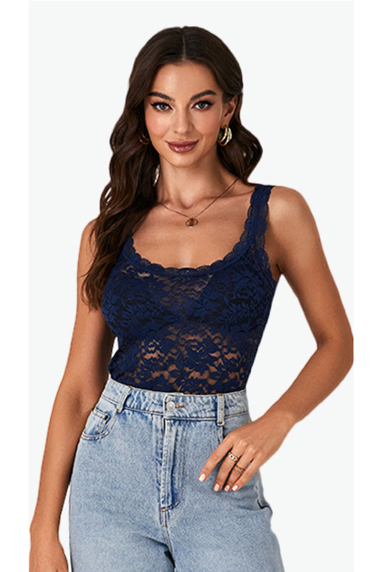 Women's Floral Lace Scallop Spaghetti Strap Sleeveless Sheer Tank Cami Top Blouse