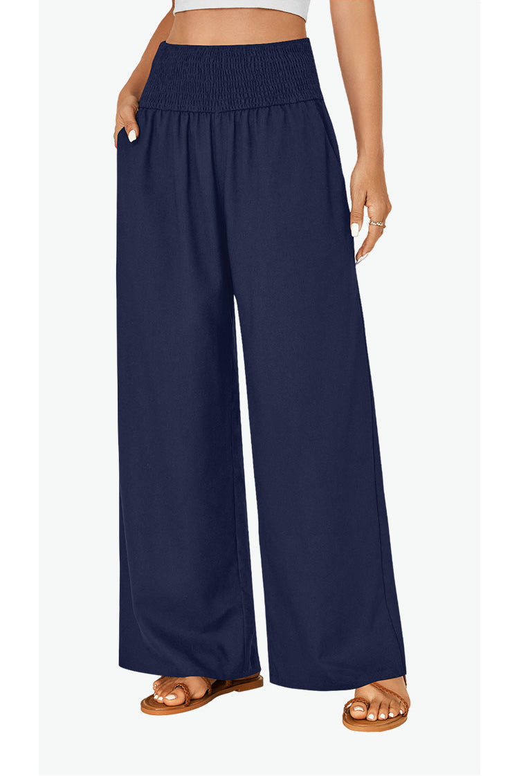 Women's Cotton Linen Palazzo Pants Elastic High Waisted Wide Leg Long Trousers with Pockets