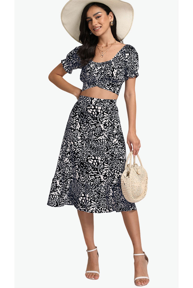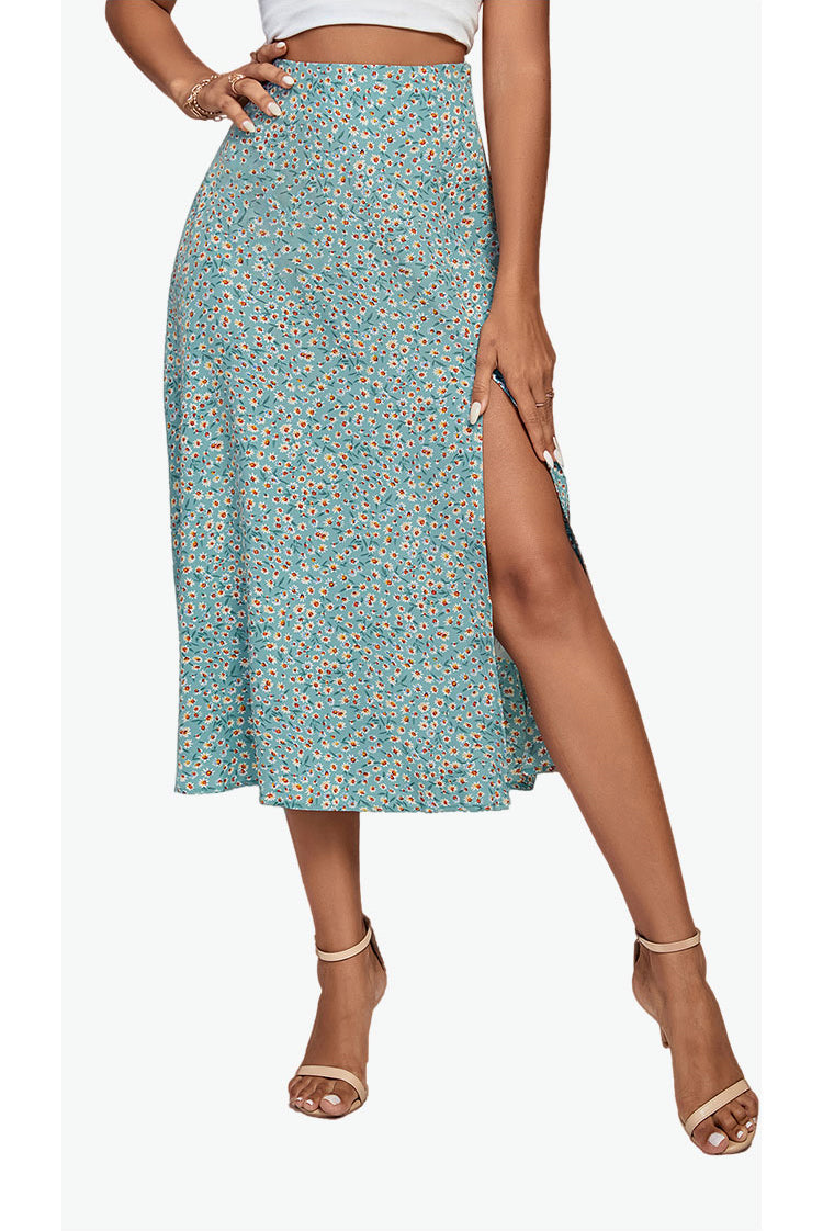 Women's Casual Boho Printed High Waist Side Split Hem Zipper Midi Skirt