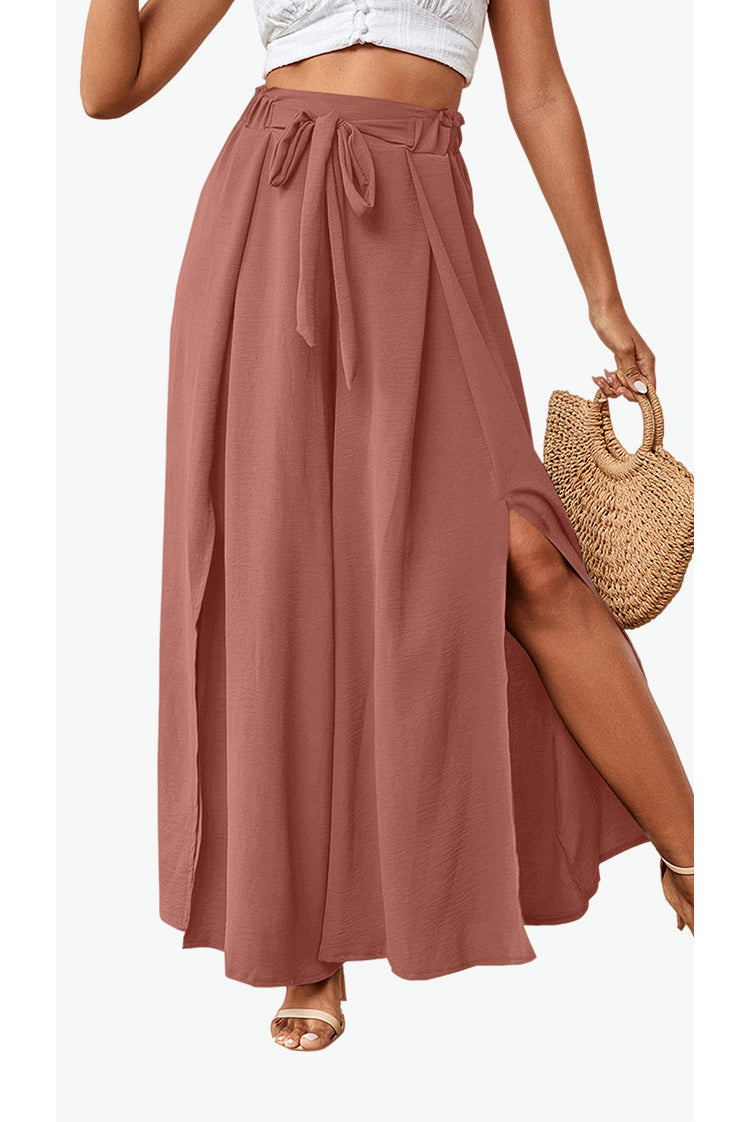 Women's Tie Front High Waist Side Split Slit Flowy Wide Leg Pleated Pant with Belt